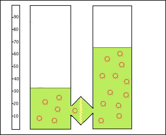In the final stage, the strength of the Infocap (its sugar-load) has averaged out and reached the same in both tanks. Small systons have passed through the membrane, and there are now twice as many of these in the right-hand tank as in the left. There may also be twice as much total infocap in the right-hand tank.