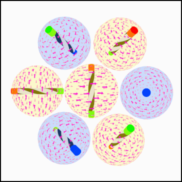 The bulk of the atom is represented as a gas-like ball of somewhat spherical shape, with arrows on the surface of the ball inserted to again give a visual sense of its motion. The ends of the axle have red and green caps added to represent the North and South poles of the vortex, and again are purely for visual effect -- though the poles do exist as defining the direction of rotation of the atoms.