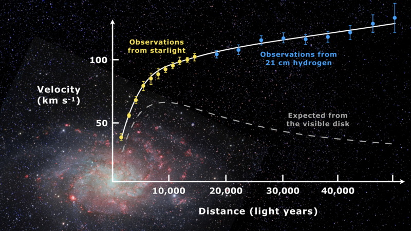 Rotation Curves of Galaxies"The rotation curve of a disc galaxy is a plot of the orbital speeds of visible stars or gas in that galaxy versus their radial distance from that galaxy's centre. It is typically rendered graphically as a plot. A significant discrepancy exists between the experimental curves observed, and a curve derived by applying gravity theory to the matter observed in a galaxy. Theories involving dark matter are the main postulated solutions to account for the variance."