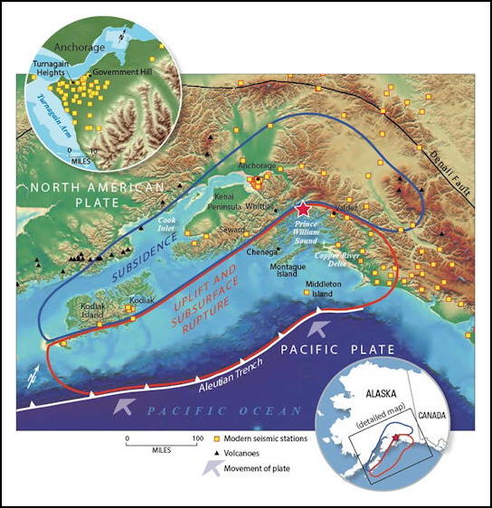 In the Alaska earthquake, vertical displacements of up to 11.5 m occurred [18]. Notice from Figure F8 how the southern Alaska coastal area is poised above the very deep Aleutian Trench, almost like being at the edge of a gigantic cliff -- slippage of the edge of this cliff seems a very possible scenario.