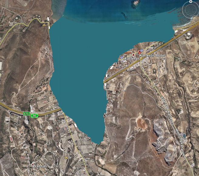 Returning now to Amnisos, we can use the elevation feature of Google Earth to trace what the area would have looked like if the local sea-level was 9 metres higher in Minoan times.