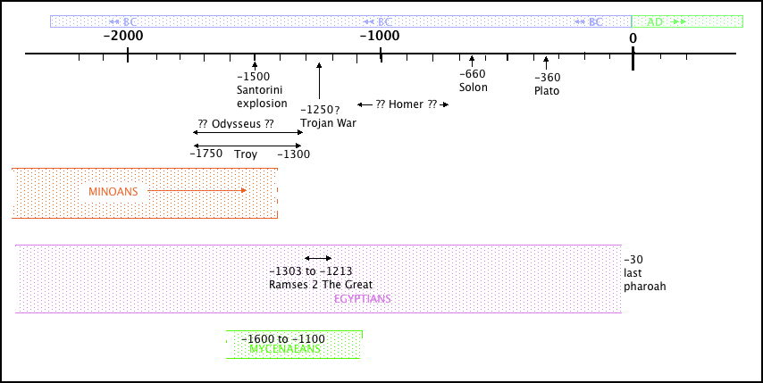 There is a time-line discrepancy concerning events in the above chart. Suppose we assume for the moment that the story of the destruction of Atlantis which came down to Plato was based on a real event, the explosion of Santorini around 1500 BC (-1500 on the chart). Plato wrote in 360 BC (-360), 1140 years later.