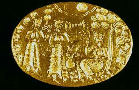 Because gold is not liable to tarnishing or decay, images such as this are wonderfully preserved, even after 3500 years. However, the drawing made from this ring brings out details better.