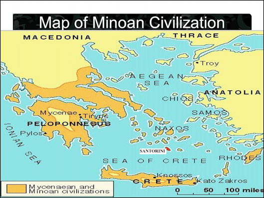 As well as Crete, the Minoans occupied some of the other islands, especially the one known as Santorini (in Italian) or Thera (in Greek), and also settled in southern parts of the Greek mainland.