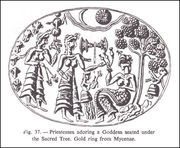 The Minoans were skilled workers in gold. It notes in [1] that "The ritual double or quadruple-axe symbol is also present in the Mycenaean iconography, like this gold ring from Mycenae dated 15th Century BC. According to Robert Graves, in the Minoan and Mycenaean cultures the ritual double-axe was forbidden to males. The double-axe was the symbol of a powerful priestess or female deity."
