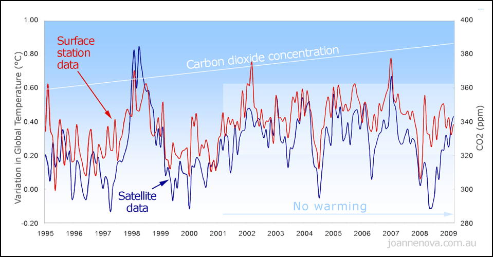 Figure CM605-F5. Earth's temperatures and CO2 levels, 1995-2009 . From [7].