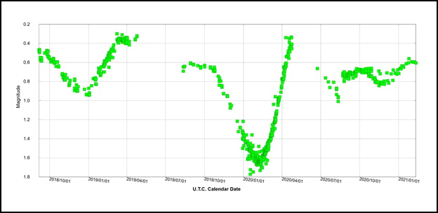 Figure CM609-F7. AAVSO V-band magnitude of Betelgeuse, between September 2018 and February 2021. From [1].