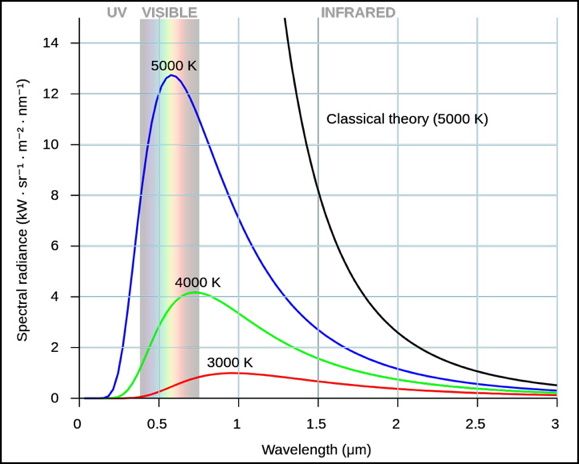 Around the same time, Wilhelm Wien discovered that the peak of the radiation curve varied with the temperature of the emitting body -- hotter bodies radiated with shorter wavelengths (higher energies). The peak wavelength was inversely proportional to the temperature.