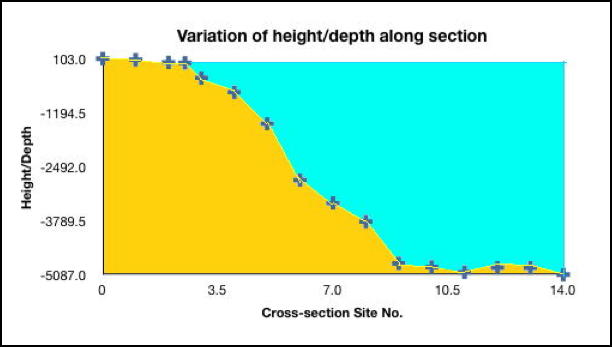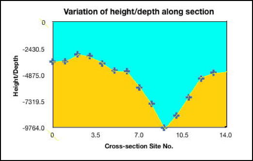 So if you move the cursor along a line which would form a cross-section of the area which interests you, and write down the height/depth at regular intervals, you can build a table which can be used to construct the cross-section. Figure 11 shows such a cross-section which I made in this way.