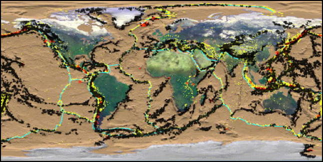 Earthquakes can be events of great threat and interest to many of the world's peoples, and have been been intensely studied during past centuries. The following figure is a map of where over 350,000 earthquakes occurred in the 35 years up to 1998.
