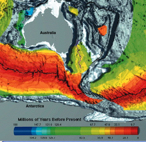 Now to support this intuition with evidence. There is an excellent map [9] showing the ages of the seabeds over the whole of the Earth. This map is the result of years of research in taking seabed rock samples and determining their ages -- none are older than about 180 million years. Here we show the part which includes the seabed between Australia and Antarctica.