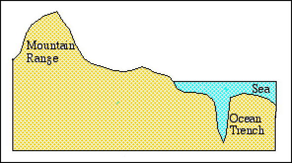 Look again at the coastal mountain/ ocean trench schematic in Fig. FOE23, also at the cross-section of the Mariana Trench in FOE17. Before the trenches started to form, the sea-floor was roughly level. Now, in the case of the Mariana Trench, the sea-floor has opened up a crack up to 6 kilometres below the original sea-floor level.