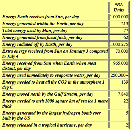 The energy released by this event has been stated as equivalent to 9,560 gigatons of TNT [16]. In standard scientific terms, 1 ton of 'TNT equivalent' equals 4.184 gigajoules. To give a feel for what these numbers mean, we can represent them as BL Units (where 1 BL unit is one-millionth of the average daily energy Earth receives from the Sun), and compare with other global energy flows.