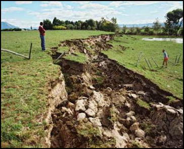 With a small local earthquake, the land is pulled apart or rifted. The effects shown in the figure, where the rift runs across a road or a field, are typical. These rifts are just what would be expected if the surface was being stretched through Earth expansion, and are are not explicable with the old tectonic-plate theory.
