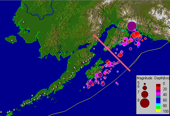 In the figure, a real-life equivalent of the notional cross-section in Fig. FOE23, the yellow line marks the location of the Aleutian Trench. The triangles mark active volcanoes [15]. Notice that the line of volcanos (also an expansion phenomenon) runs parallel to but displaced from the trench bottom, and from the earthquake line. Such a displacement, which implies that volcanos appear on the slope rather than high up or low down, is quite common.