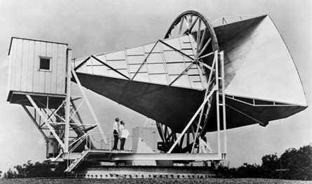 Fig. EP302-F30. The Holmdel, N.J., horn antenna on which Penzias and Wilson (seen in the photo) discovered the cosmic microwave background radiation in 1965. From [24].