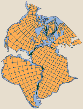 Different people had somewhat different ideas about just how the different continents could be stuck back together to re-form Pangaea. Invariably, South America and Africa would be joined, with North America above South America, and Europe abutting on North America. The following shows one such representation.