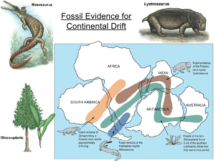 When the occurrences of certain fossil groups in southern Africa, South America, India, Australia, and Antarctica were studied, it was found that their distributions seemed to link together these lands. These fossils included two land reptiles, a freshwater reptile, and an ancient fern, Glossopteris.
