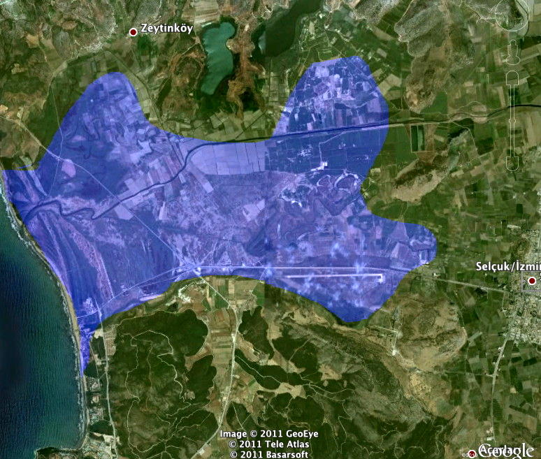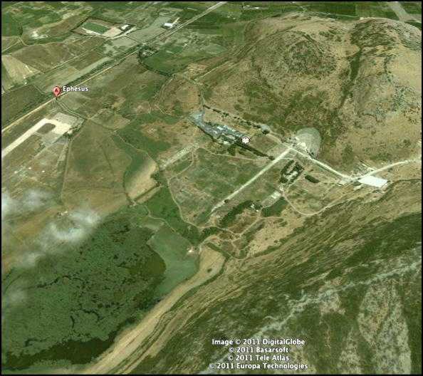 In the picture, ancient Ephesus is a couple of kilometres south of the red marker. The harbour road can be seen going WNW from the amphitheatre (cloudy white patch) towards a shallow green lake, all that remains of the harbour.