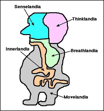 In Figure ILF9, the human body is shown divided up into five ecosystems or "continents" (obviously this is very simplified). The digestive system is called "Innerlandia". It is quite different to the other four, these are intricately interconnected, with networks of nerves, blood vessels, lymphatic systems, and bones (with continents, these might be railways, roads, telephone lines, canals, and so on).