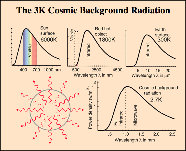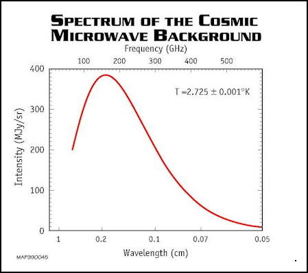 When CMBR was first detected, it was noticed immediately that it conformed closely with black-body radiation from very cool objects at around 2.7 K -- that is the origin of the T = 2.75 K equation in Figure F3.