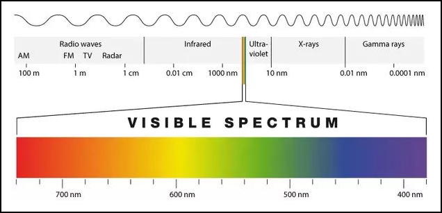 The place where a given bit of radiation falls in the whole spectrum is determined by its wavelength. In the figure, shorter wavelengths are shown on the right. Shorter wavelength is the same as higher frequency, and higher energy, so the highest known energy is found in gamma rays, with wavelengths less than 0.01 nm (1 nm or nanometre is one-billionth of a metre).