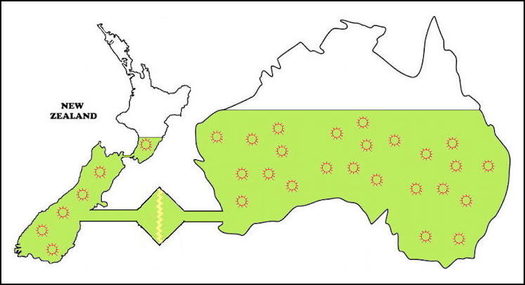 Let's look at another case, with two countries differing only a little in infocap strengths -- New Zealand and Australia. We'll use rather more evocative outlines to represent the two countries.