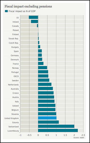 Figure MT202-F14. The OECD estimate for the impact of immigration on the public finances excluding pensions -- showing a 1.02 per cent GDP contribution. From [9].