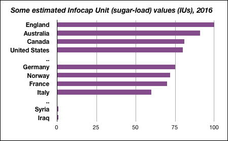 There is no standard formula at present for calculating the Infocap strength -- the sugar-load -- of a country. But we can move closer to this by using "proxies" -- things which appear to move in conjunction with infocap. A proxy from another area is the use of tree rings as indicators of the rainfall and temperature levels of earlier years.