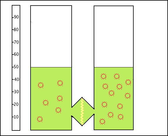 In the final stage, the strength of the Infocap (its sugar-load) has averaged out and reached the same in both tanks. Small systons have passed through the membrane, and there are now twice as many of these in the right-hand tank as in the left. There may also be twice as much total infocap in the right-hand tank.