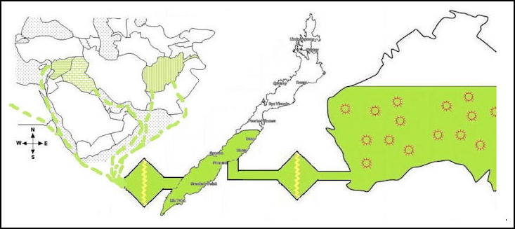 The land area is called a County because it would need to be of similar size to an English county, big enough to have its own airports, dock towns, cities, and transport networks. In Figure F13, as a possible example, part of the island of Palawan in the Philippines has been arbitrarily picked.