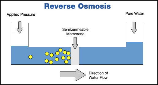 In Reverse Osmosis, a liquid container has two parts separated by a membrane. Pressure is applied to the part of the container holding a liquid which contains impurities or dissolved salts or chemicals.
