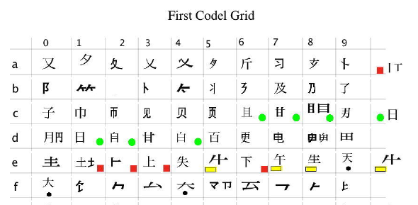 To identify characters using the Codel System, you will need constantly on hand two pages called "Codel Grids". Download each of these and print them out with a colour printer (it's possible in theory to refer to these grids online at this site, or in your MandarWeb folder, but in practice this would be very clumsy). Here is an extract of part of one page.