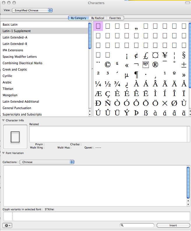 Check and adjust if necessary so that the "View" box at top left shows "Simplified Chinese" and the panel at top centre is set to "By Category". Also that the little triangles on "Character Info" and "Font Variation" point downwards, and "Collections" is set to "Chinese".