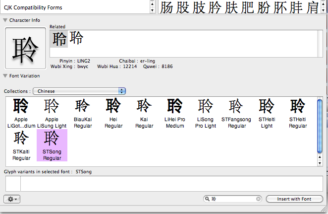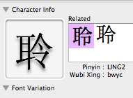 But notice, in this case, that other forms of the character appear in the "Related" box. Variations in the Codel parts of Chinese characters are usually topologically the same (bits varying in size and position, but connected in the same way). In this case they are quite different.