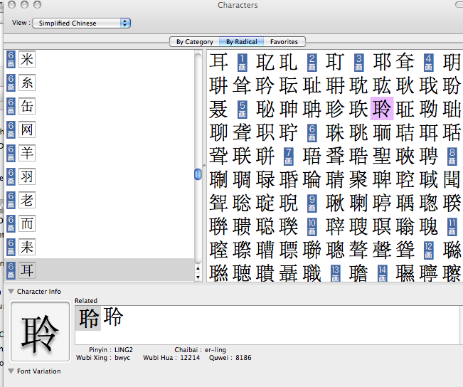 The radical used in this character is shown at the bottom of the list at left, and "ling2" character is highlighted on the right. The radical itself contains 6 strokes, 5 more are needed to create "ling2". If you click on a different character on the right, maybe one which looks rather similar, you will get information about that character.