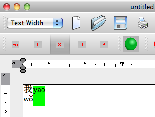 When you open a new file on MacKEY for the first time, you can accept the default settings, and change these as you gain experience to suit your needs. I like to be able to type in Pinyin, and have the character appear with the Pinyin (with tone) on the next line. I use the default font (KEY GB Mingti) at a point size of 17 (fairly large).