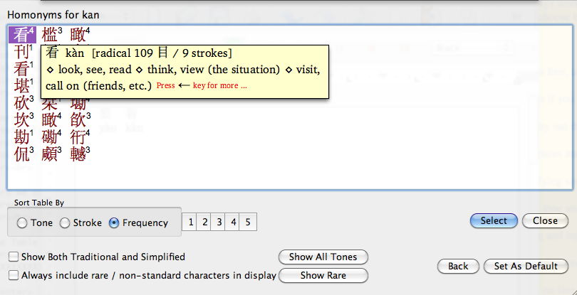 Or, if you know the tone of the character you want, you can click on one of the tone boxes, 1, 2, 3, 4, or 5, and options with other tones will disappear from the list (box 5 is the equivalent of MandarWeb "kan0"). This is useful for Pinyin syllables which have a lot of equivalent characters.
