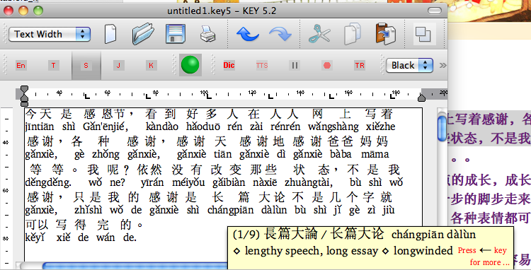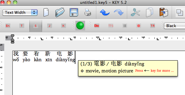 But easily the most useful feature is the Tooltip Dictionary (set in the KEY Menu bar at "Language/ Enable Dictionary Tooltip"). With this, if you hover your mouse over a character, a yellow panel shows a short dictionary definition of the character. Also shown is the simplified character (plus the traditional form, if different), plus its "radical" derivation (in this case, from Radical 109 plus 9 strokes).