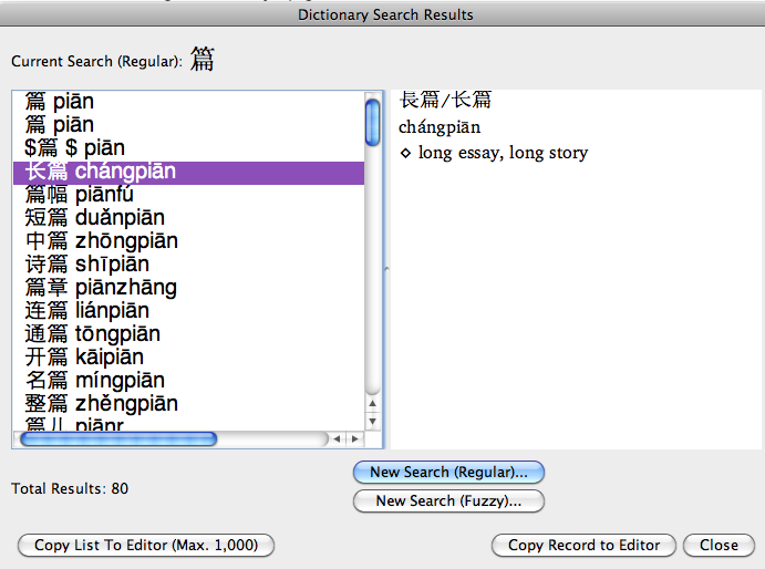 In this example, the character "pian1" is looked for. The result contains 80 instances of the use of the character.
