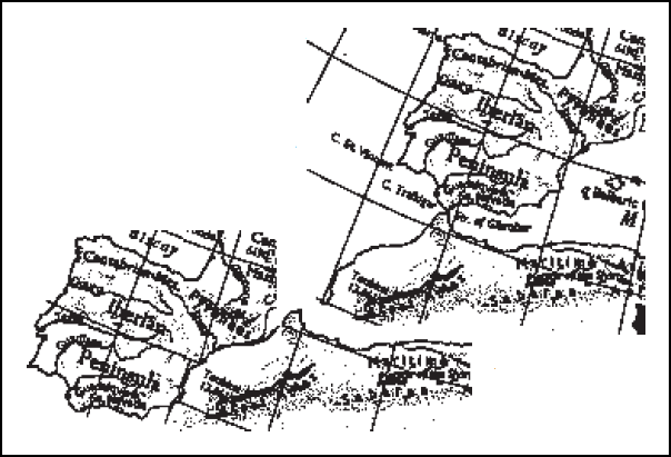 The point is, that the edges of domains produced by the splitting apart of bigger domains are not greatly altered by subsequent events, at least not on the scale on which we are working, say in distances of up to 100 km. On this scale, the current sea-level boundaries of land domains bordering on the sea are an accurate enough indication of their edge positions in the past.