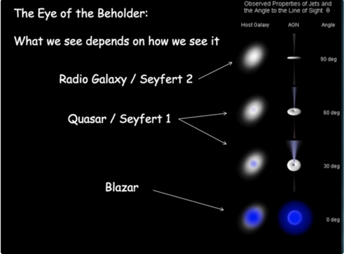 It was later realized that all these entities were actually the same sort of object, with the apparent differences due to the angle at which they were viewed, as in Figure F3. In most cases, telescopes were picking up secondary effects from the Vortex Beams, of relatively lower power. Only when viewed directly along an axis, at right angles to the plane of the rotating galaxy, was the high-energy primary beam being picked up, and the galaxy put in the highest-radiation class, a Blazar.