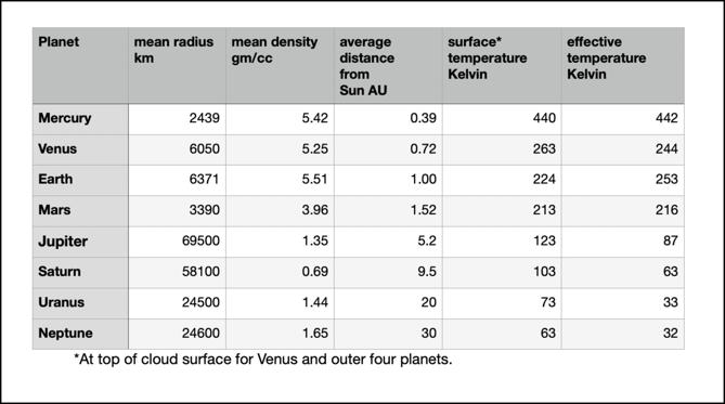 Figure F2 shows a table of data on the planets of the Solar System. Some of the figures quoted (radius, distance from Sun) are well-defined. Mean density is given, but has a different meaning for the rocky planets and for the outer planets (which include their thick atmospheres).