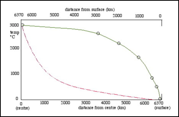 Calculations of actual temperatures at various depths in the Earth show that this picture does not match with reality. Figure F5 show two curves, of temperature versus depth within our planet.