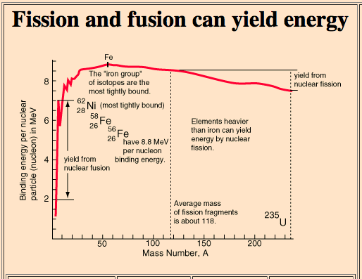 Figure F3 shows how this stability varies with mass number of elements. Elements lighter than Iron can yield energy if they take part in fusion, elements heavier than iron can yield energy if they undergo fission.