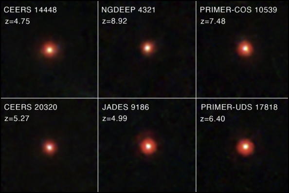 Here are snippets from [1] and [2] which are not exceptional in the Real Universe paradigm. LRDs "only appear in the early universe. They disappear from surveys around a redshift of 4, meaning when the universe was less than 2 billion years old". Most of them "are active galactic nuclei, or AGN". "There are far more of them -- 10 to 100 times more -- than other surveys have indicated, whether they are quasars, AGN, or some other form of active black hole".