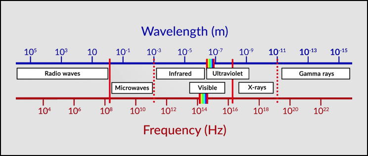Figure F3 shows the electromagnetic radiation spectrum, which ranges from the longest wavelengths (radio waves) to the shortest wavelengths (gamma rays). The visible-light spectrum is quite a small part of this.
