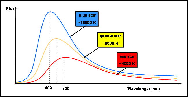 The colour of light is an expression of its wavelength. The light from blue stars has its peak at wavelength of about 400 nm (a nanometre, nm, is a billionth of a metre). Red stars peak at about 700 nm.