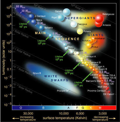 One of the best guides to understanding these properties can be had using a chart developed in the early 1900s, called the Hertzsprung-Russell Diagram (Figure F1).