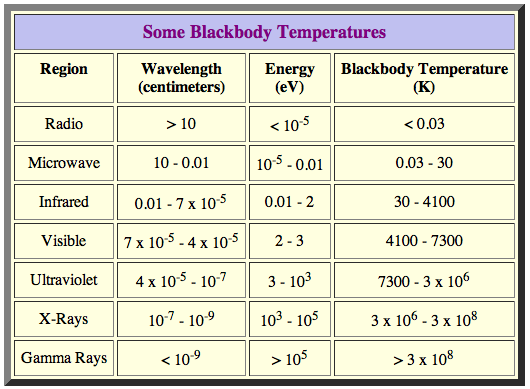 The following table summarizes the blackbody temperatures necessary to give a peak for emitted radiation in various regions of the electromagnetic spectrum.